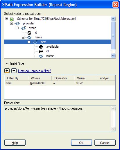 <xsl:for-each select="provider/store/items/item[@available = 'true']"> Content goes here </xsl:for-each>注意:您需要将字符串值(如 true)用引号引起来。Dreamweaver 会对引号 (') 进行编码,以便它们能够作为有效的 XHTML 输入。