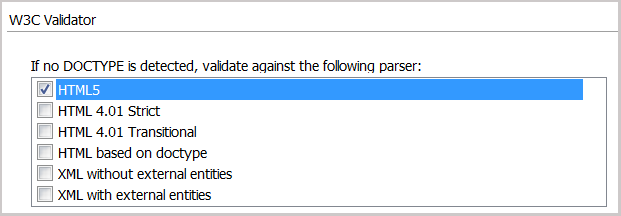 与上一版本的 Dreamweaver 中一样,如果 Dreamweaver 无法根据文档内容类型或 DTD 识别解析程序,您仍可以指定 Dreamweaver 可挑选的回退解析程序。只更改了与使用新验证程序有关的可用解析程序列表。