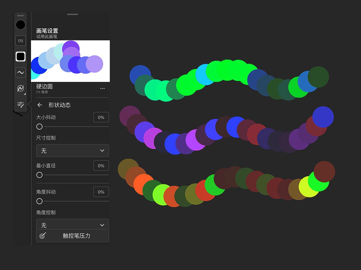在绘制任何笔触时,增强任何绘画的颜色、色相、饱和度、亮度、抖动设置和颜色动态。