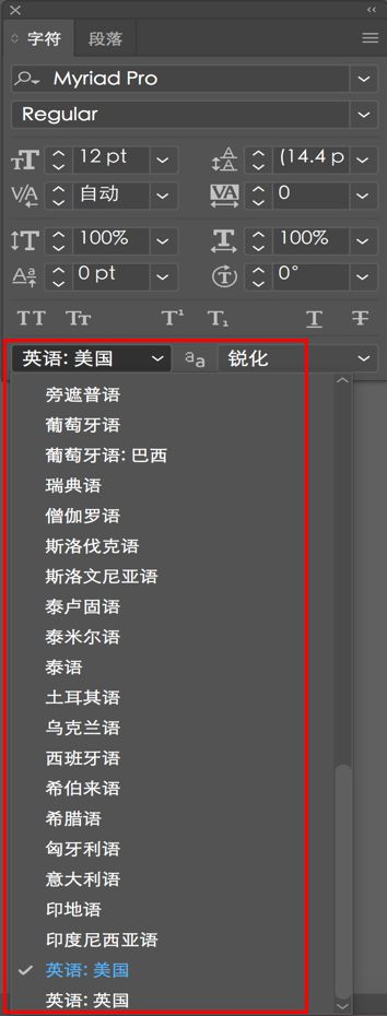 您可以在“属性”面板字符部分的语言下拉菜单中选择相关语言选项,如下所示。此选项用于检查连字和拼写。