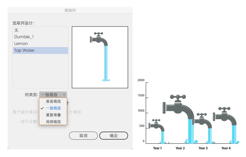 堆积设计以填充柱形。您可以指定每个设计表示的值,以及您是否要截断或缩放表示分数字的设计。