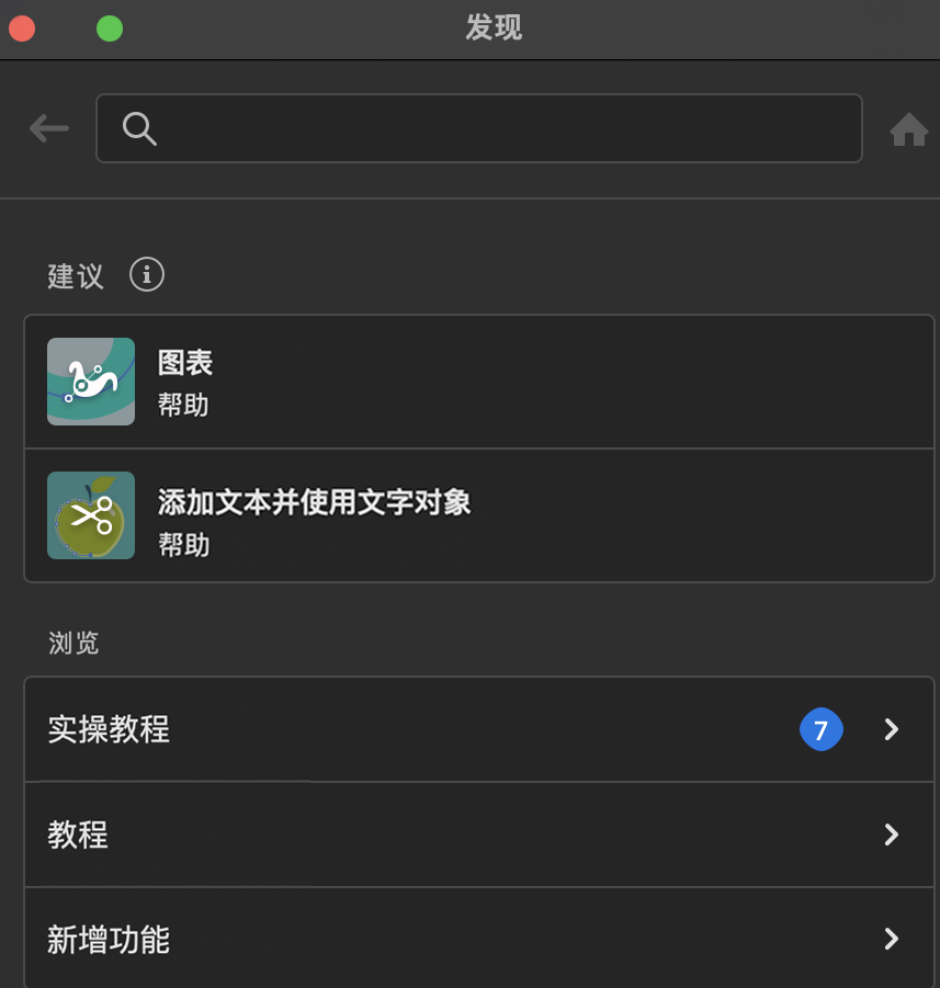 发现新内容!跳过搜索,使用这一部分轻松查找应用程序内教程,以及最新 Illustrator 功能的相关信息。 |