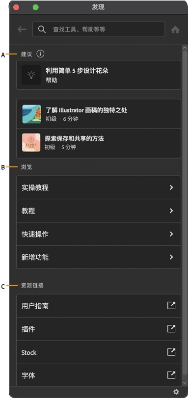 “发现”面板提供了上下文相关帮助和学习资源,可快速查找文章,并可利用 Illustrator 中的工具高效地工作。