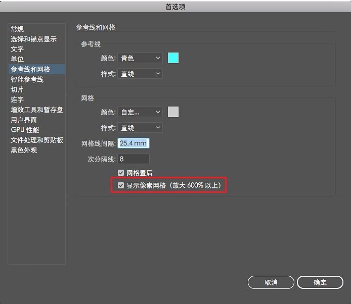 即使在高缩放级别下,您也可以选择不在“像素预览”模式下查看像素网格。 在 Illustrator 中,取消选择首选项 > 参考线和网格 > 显示像素网格(放大 600% 以上)。