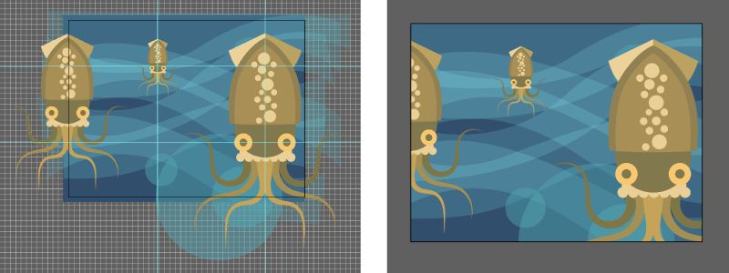 裁切视图以适应图稿的边界。在此模式下,包含画布上所有非打印对象的图稿都是隐藏的,如网格、参考线和延伸到画板边缘之外的元素。落在画板之外的任何图稿都将被剪切。您可以在这种屏幕模式下继续创建和编辑图稿。