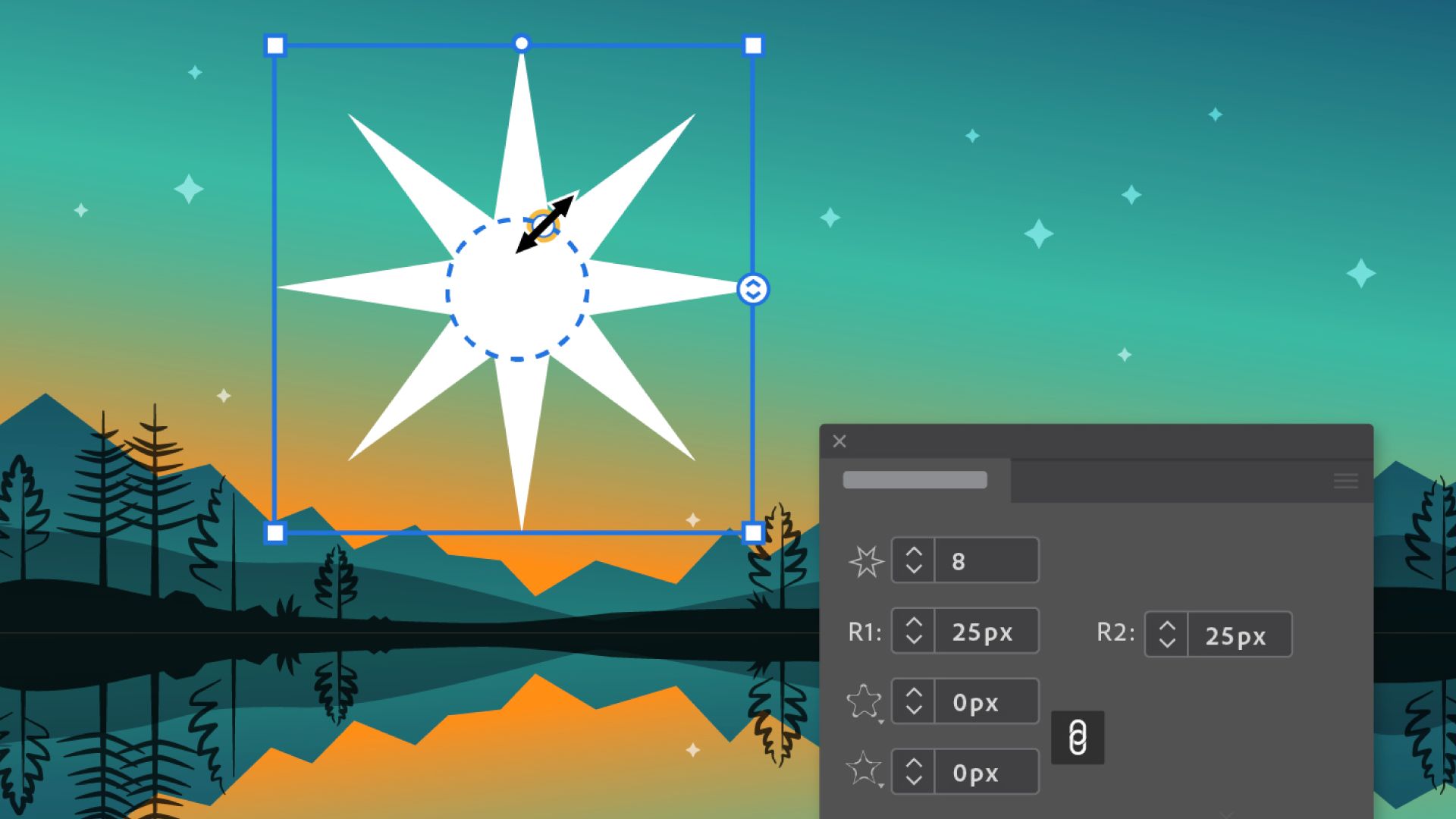 使用星形工具创建的星形现在都是实时形状 — 您可以调整其属性以满足您独特的设计要求。使用直观的形状上的构件或属性或变换面板,轻松调整星形的边数、内外半径以及内外圆角半径。详细了解修改星形。