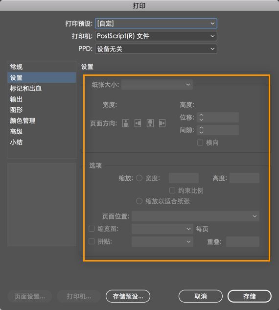将 InDesign 文档打印为 PostScript 文件时,用于自定义页面的选项处于禁用状态。