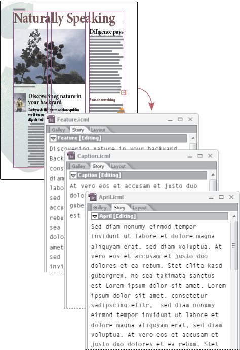为了在整个版面的上下文中看到所有页面项目,InCopy 用户可以在 InCopy 中打开和编辑 InDesign 文档。如果看到整体版面很重要,或者要编辑文档中的大多数文章而不仅仅是几篇文章,则进行编辑和版面组排时可以采用这种方法。在 InCopy 用户编辑完这些文章后,InDesign 用户就可以更新链接,使其链接至修改后的文件。如果 InDesign 用户更改了版面,则在存储 InDesign 文档时将会通知 InCopy 用户。