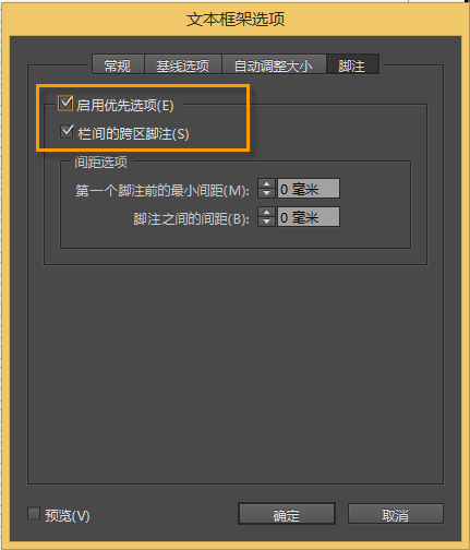 选中“启用优先选项”和“跨栏分布脚注”。