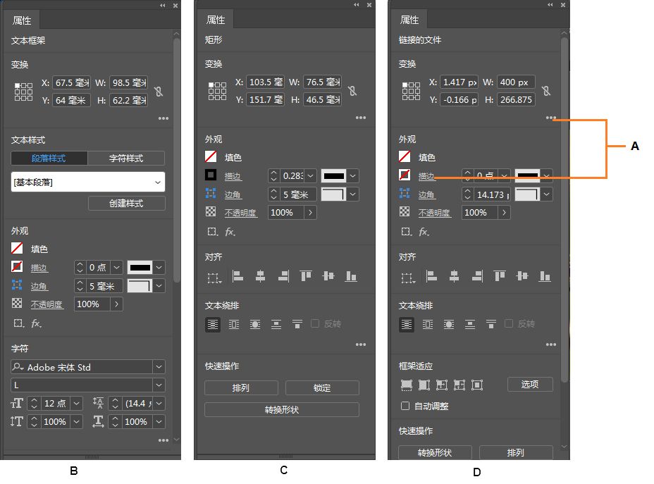 - 变换和外观控件:宽度、高度、填充、描边、不透明度等.