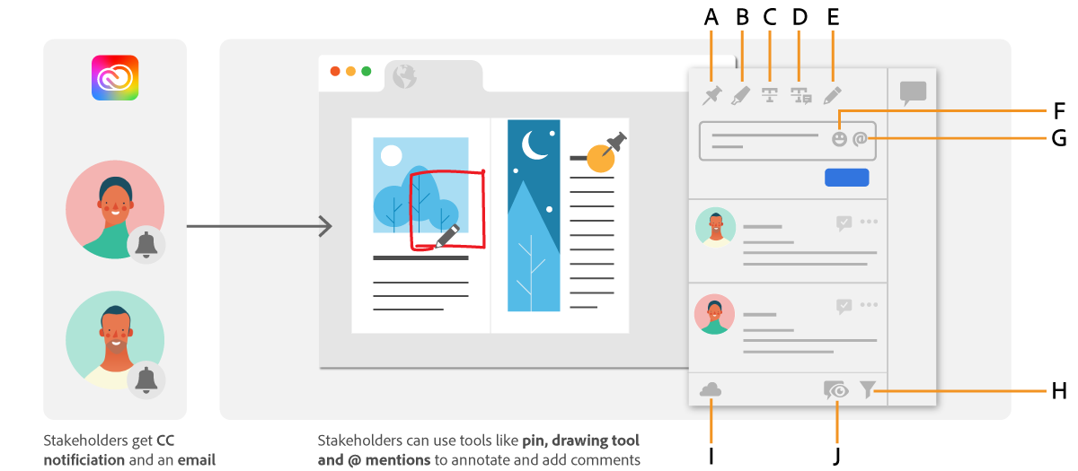 添加注释时,可提及某个用户。如果您使用此选项,则提及的审阅者会在电子邮件和 Creative Cloud 应用程序上收到通知。您可以在选择通知时访问设计中的引用注释部分。 |