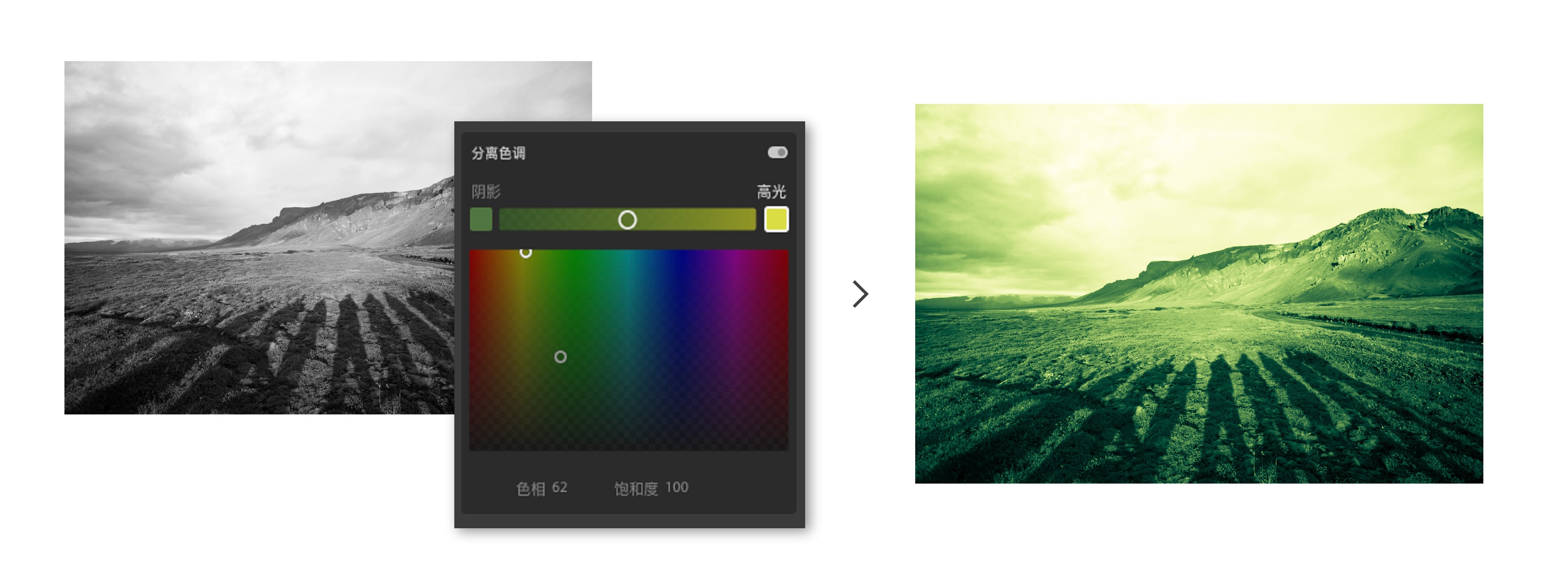 平衡增强所有颜色的饱和度。向左移动滑块可对颜色去饱和;向右移动滑块可增强饱和度。