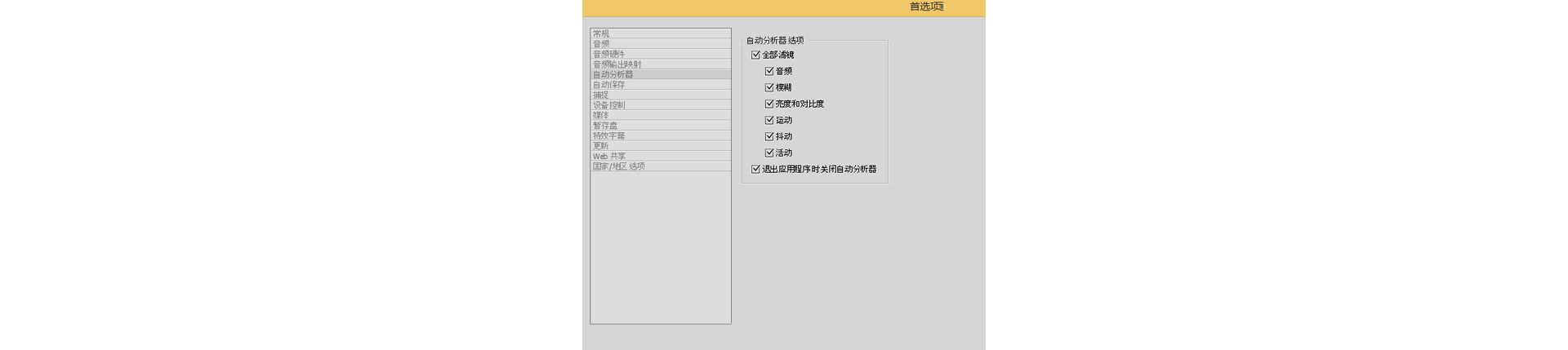 - 退出应用程序时关闭自动分析器:选中后,如果关闭 Premiere Elements,将关闭正在后台运行的自动分析器进程。