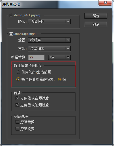 要完成此操作,在“序列自动化”对话框的“静止剪辑持续时间”下,选择“每个静止剪辑的帧数”并输入帧数。
