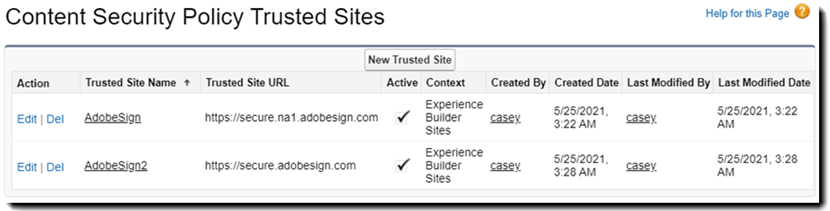 您必须配置两个 CSP(内容安全策略)受信任站点,以允许您的 Adobe Acrobat Sign 帐户使用基本 URL。具体操作如下: