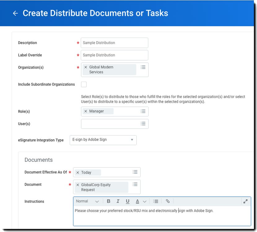 在 Workday 30 中引入的“批量分发文档或任务”任务可用于将单个文档发送给大量(不超过 20000 个)的个人签名者。 它仅限于每个文档的单个签名。 通过从搜索栏访问“创建分发文档或任务”操作来创建分发。