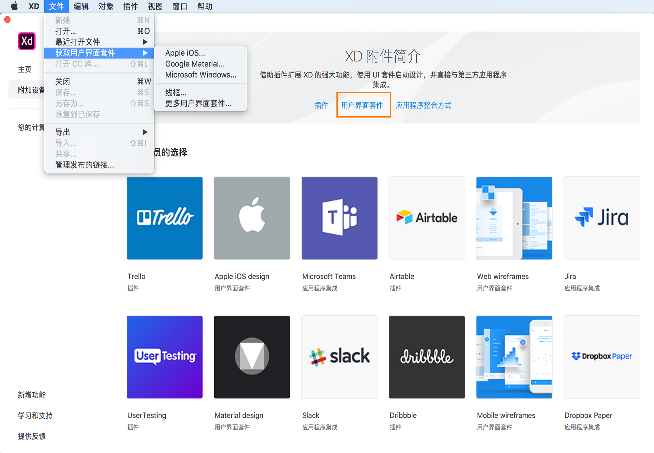 了解如何访问 XD 内的 UI 套件、插件和应用程序整合。