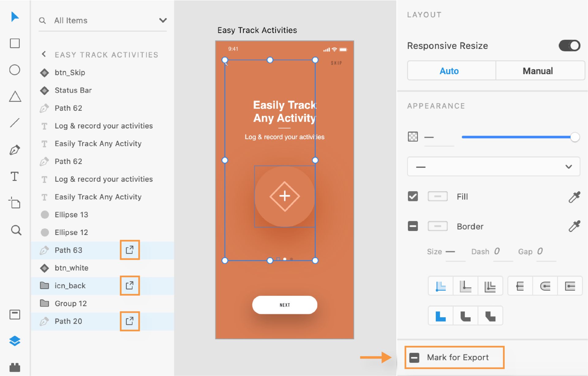 - 单击任意画板图层,然后从弹出菜单中单击“添加导出标记”复选框。