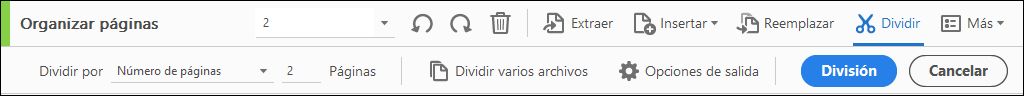 Puede dividir uno o más archivos PDF en varios archivos PDF más pequeños. Al dividir un documento PDF, puede especificar la división según la cantidad máxima de páginas, el tamaño de archivo máximo o los marcadores de nivel superior.