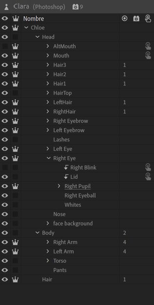 Organice y etiquete las capas de forma similar a las del comportamiento Cara. Sin embargo, solo usa las etiquetas Cabeza, Ojo izquierdo, Ojo derecho, Pupila izquierda, Pupila derecha, Rango de la pupila izquierda y Rango de la pupila derecha.