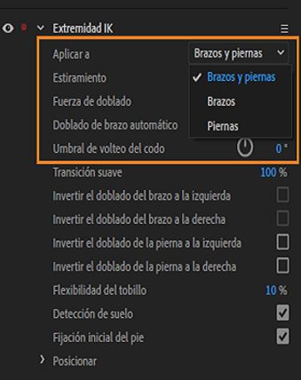 En el panel Propiedades, en el comportamiento Extremidad IK, utilice el desplegable Aplicar a para usarla en brazos, piernas o ambos.