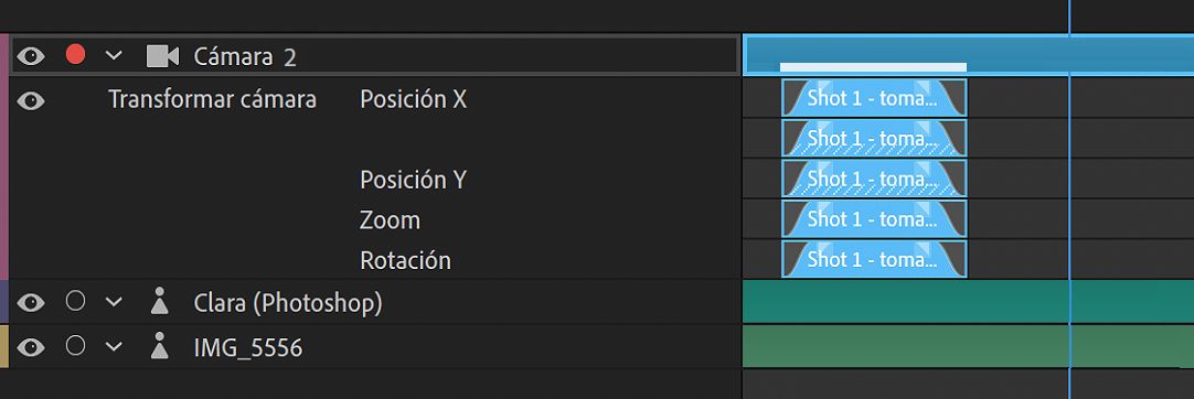 Puede mover, recortar o volver a grabar una toma mediante el ajuste de los parámetros dentro de la opción Transformación de cámara en la pista de Cámara. Transformar cámara Transformar cámara
