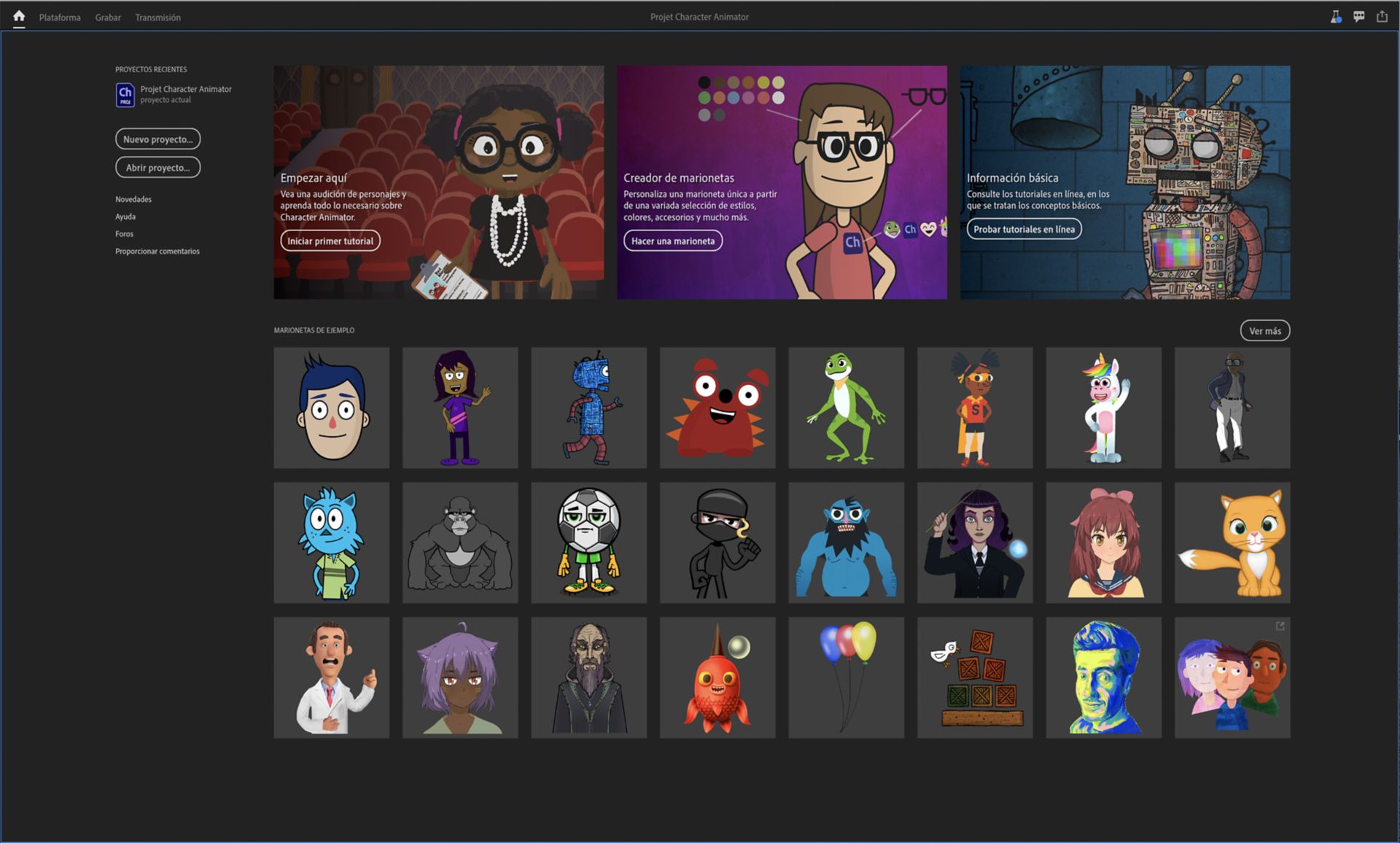 Al iniciar la aplicación aparece la pantalla de inicio. El espacio de trabajo incluye distintos recursos, como un videotutorial interactivo de introducción, recursos útiles en línea y plantillas de marionetas. Puede utilizar los recursos para aprender a usar Character Animator o empezar a experimentar con la animación de plantillas de marionetas.