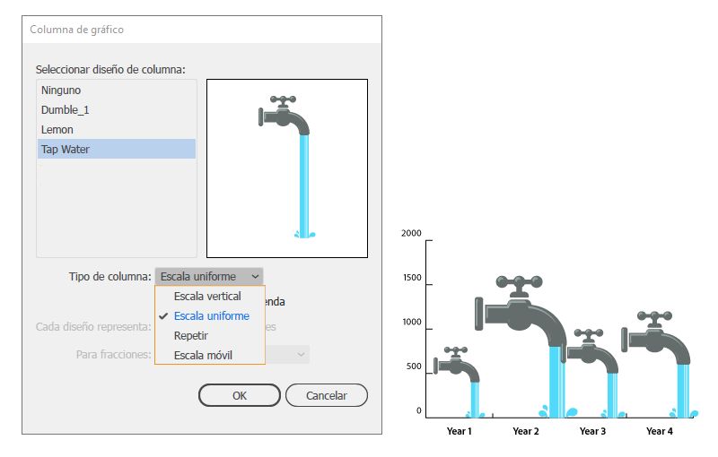 Se apila hasta rellenar las columnas. Se puede especificar el valor que representa cada diseño y si se desea cortar o cambiar la escala de los diseños que representan fracciones.