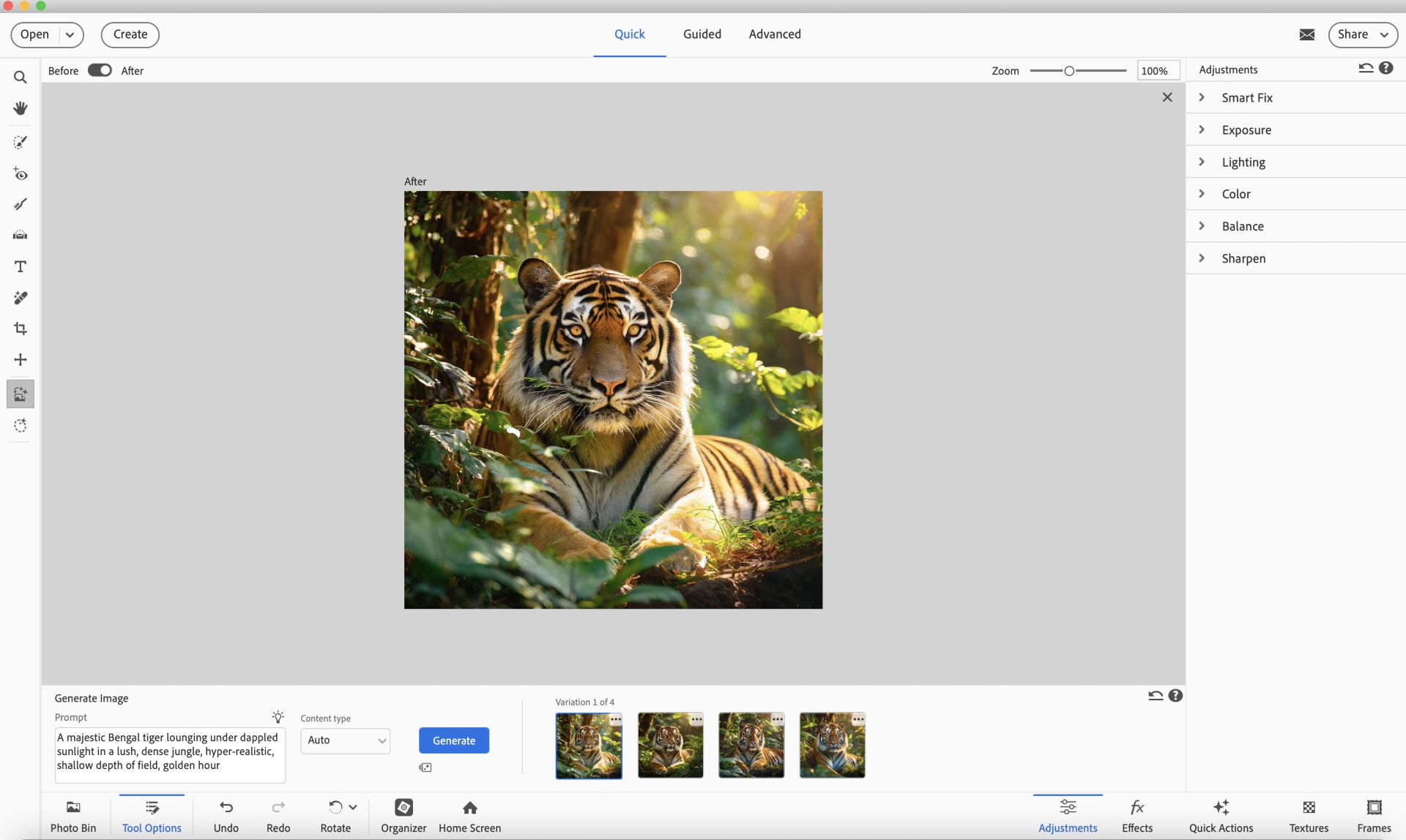 La IA generativa en Photoshop Elements abre un mundo completamente nuevo de posibilidades creativas.¿Desea cambiar un fondo desordenado por algo limpio y profesional?¿O quizás generar una escena personalizada para un Fotolibro familiar, un collage de viajes o incluso una tarjeta de felicitación personalizada?Simplemente escriba lo que está imaginando y Generar imagen lo hará realidad.