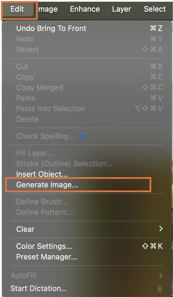 1. Seleccione la herramienta Generar imagen en la barra de herramientas.También puede acceder a Generar imagen desde el menú Editar .