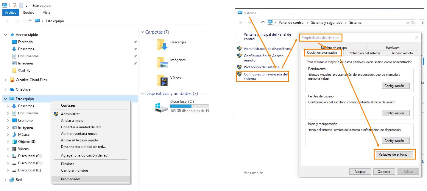 En el cuadro de diálogo Propiedades del sistema, haga clic en la ficha Avanzadas y después en Variables de entorno.