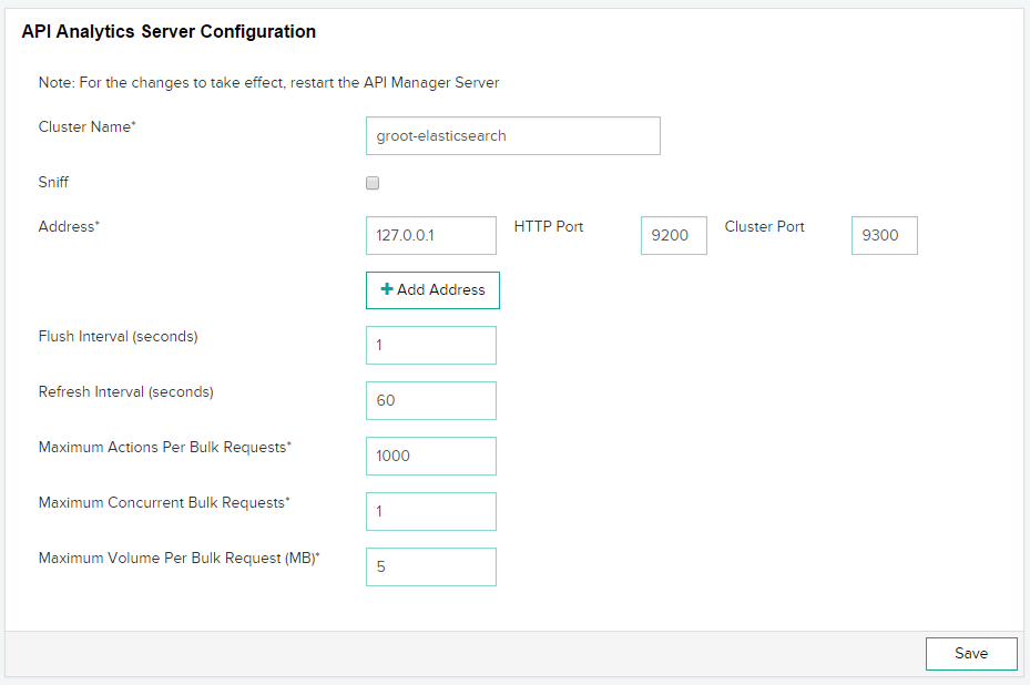 Maximum Actions Per Bulk Request- Enter the number of API requests that are collectively sent to the ElasticSearch server for metrics calculation and visualization. If you enter 1000 in the field, no more than 1000 requests can be sent to the server.