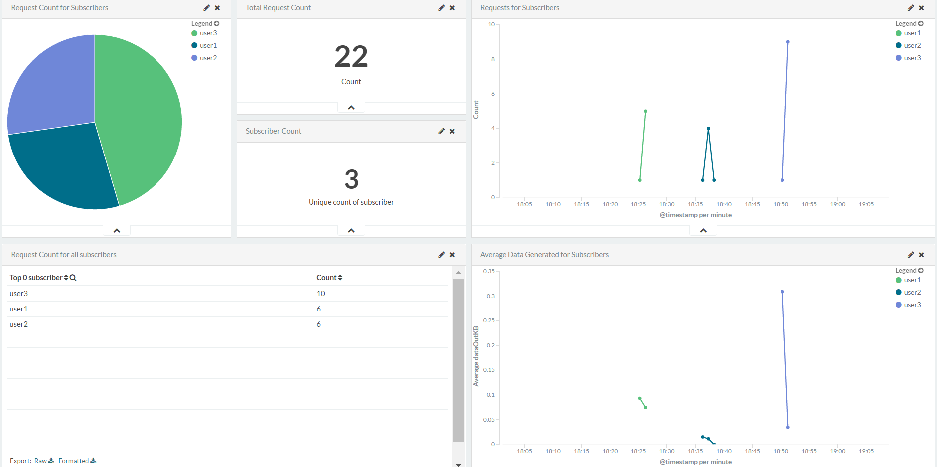 The Subscribers dashboard provides information about the number of subscribers and requests served per subscriber. The dashboard consists of a visualization for request count for subscribers, request count for APIs, and request count for all subscribers, among other visualizations.