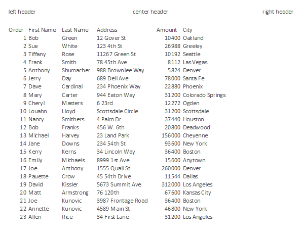 The added header appears on the printed worksheet document. You can pass empty strings in places where you do not require headers. For example,