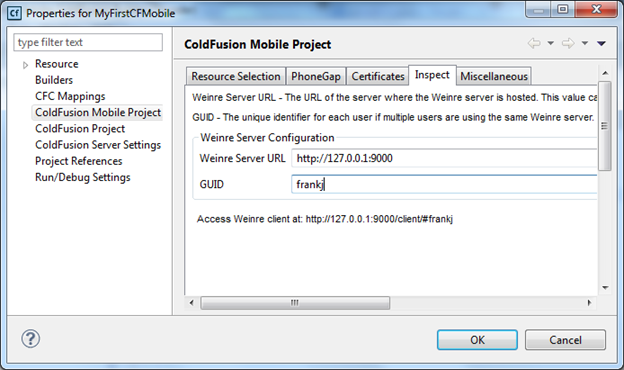 When you have a local Weinre Server running, right-click the ColdFusion Mobile project, select Properties > ColdFusion Mobile Project and click the Inspect tab. Enter the Weinre Server URL. If a local Weinre Server is running provide the loopback address. You can provide a unique ID/GUID that will identify your debug sessions in the Weinre Server.