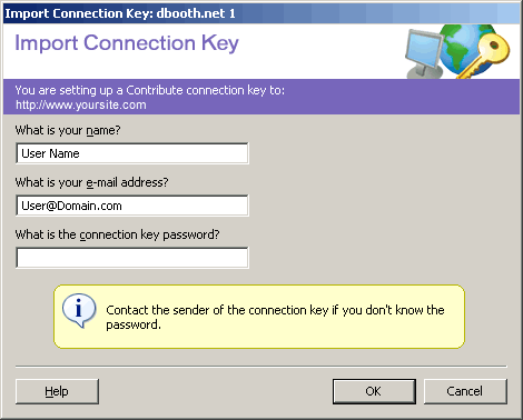 If you are using a connection key, double-click the key. You are prompted for the key password. The Contribute admin provides this key. The site is then set up automatically.