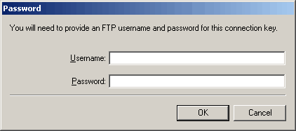 To connect to a site, a user name and password are necessary to access the server. A connection key can, but doesn't always, include server login information. This login information is separate from the key password mentioned in the paragraph above. If they key includes the server login information, then it's unnecessary to enter it. However, if the Contribute administrator did not include their login information in the key, you need your own login information. In this case, after entering the connection key password, you are prompted for the server login information.