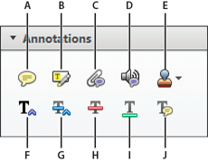 A. Přidat lístek s poznámkou B. Zvýraznit text C. Připojit soubor D. Nahrát zvuk E. Přidat nástroj a nabídku Razítko F. Vložit text v místě kurzoru G. Nahrazení textu H. Přeškrtnutí I. Podtržení J. Přidat k textu lístek s poznámkou