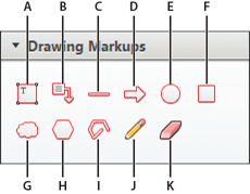 A. Přidat textový rámeček B. Přidat textový popisek C. Kreslit čáru D. Kreslit šipku E. Kreslit elipsu F. Kreslit obdélník G. Kreslit oblak H. Kreslit mnohoúhelník I. Kreslit spojené čáry J. Kreslit volný formulář K. Vymazat volný formulář