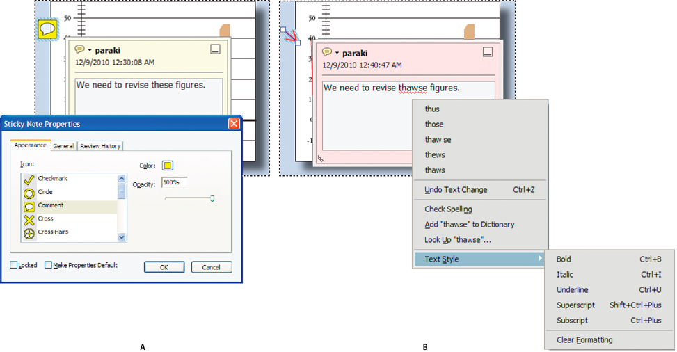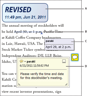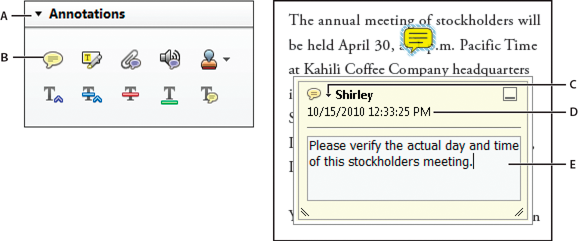 Většina poznámek má dvě části: ikonu nebo označení, které se zobrazuje na stránce, a textovou zprávu, která se objeví v rozbalovací poznámce, když poklepete na ikonu nebo na ní umístíte kurzor myši.