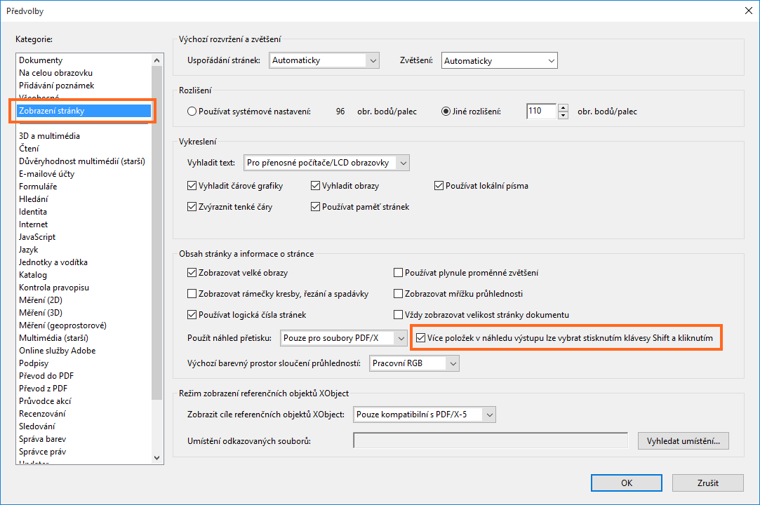Chcete-li tuto funkci zakázat, přejděte do nabídky Úpravy > Předvolby > Zobrazení stránky a zrušte zaškrtnutí možnosti Více položek v náhledu výstupu lze vybrat stisknutím klávesy Shift a kliknutím v části Obsah stránky a informace o stránce.
