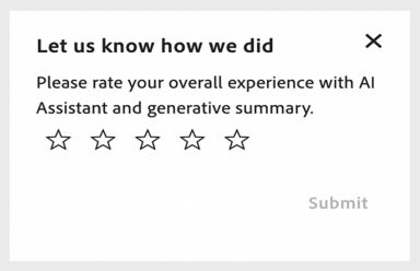 Když použijete funkce umělé inteligence čtyřikrát nebo vícekrát, aplikace Acrobat nebo Acrobat Reader vás vyzve, abyste ohodnotili své celkové zkušenosti s funkcemi AI Asistent a Generativní souhrn. Vyberte hodnocení a odešlete je. Widget zobrazí textové pole pro zadání zpětné vazby, pokud je vaše hodnocení dva nebo méně.