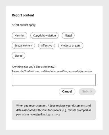 Můžete dokonce nahlásit obsah, který je podle vás nevhodný. Společnost Adobe vaše připomínky přezkoumá a v případě potřeby přijme příslušná opatření.