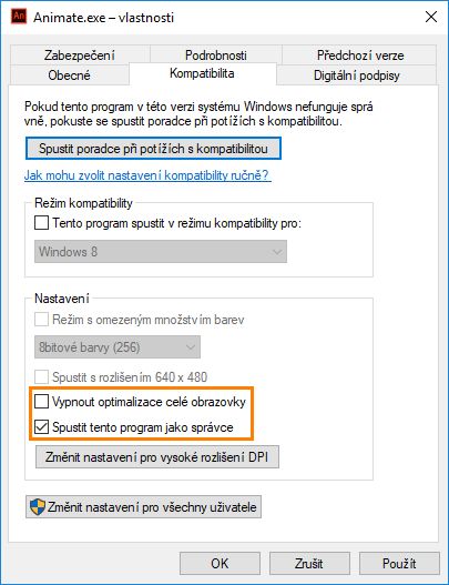Klikněte pravým tlačítkem na aplikaci Adobe Animate 2017 a vyberte možnost Vlastnosti v následující cestě: