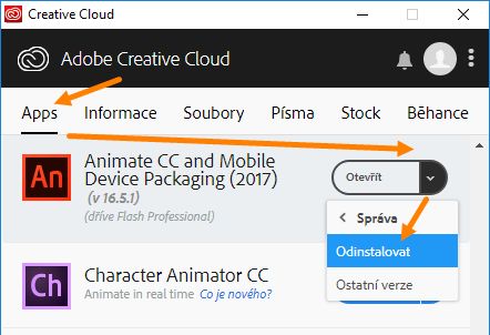 Pomocí počítačové aplikace Creative Cloud znovu nainstalujte aplikaci Animate.