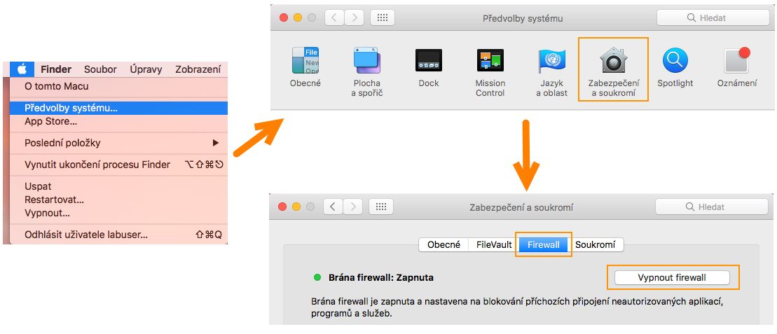 Chcete-li vypnout bránu firewall, proveďte následující kroky: