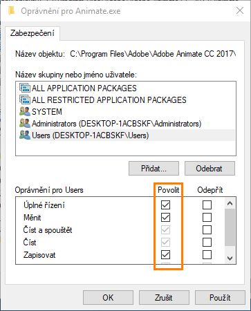 Vyberte uživatele a zaškrtněte možnost Úplné řízení.