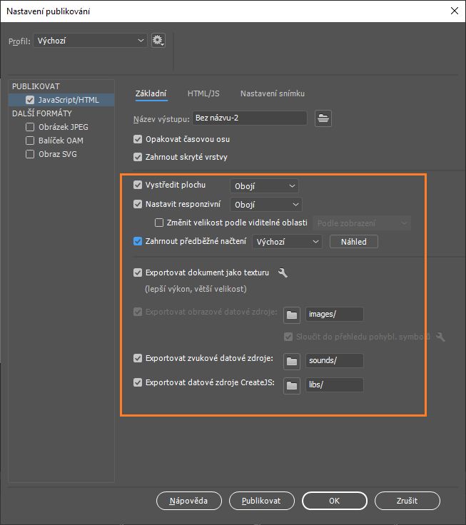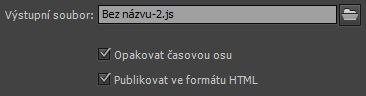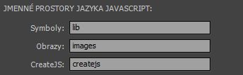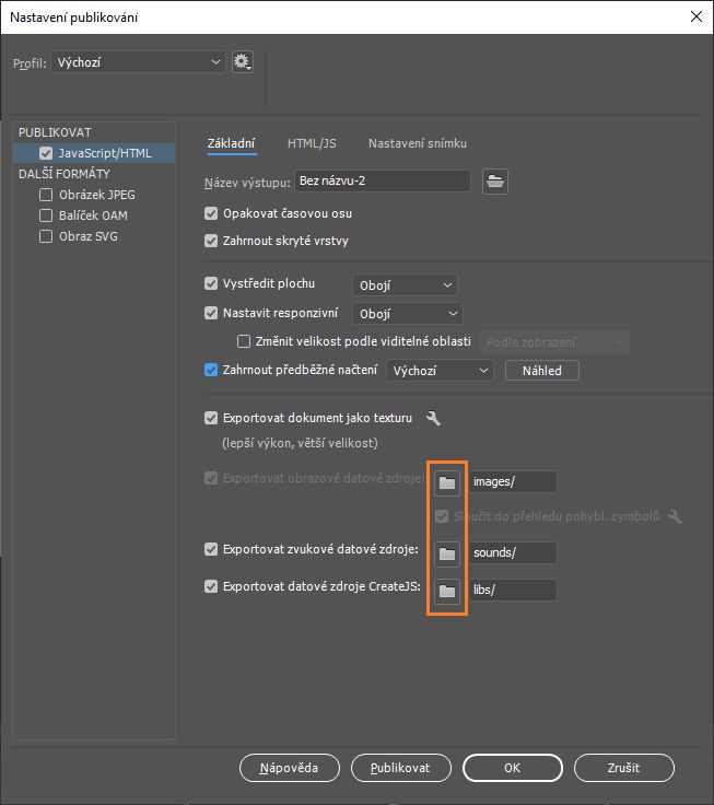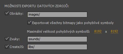 • Pokud zrušíte zaškrtnutí možností exportu datových zdrojů obrázků, zvuků a pomocných knihoven JavaScriptu rozhraní CreateJS a použijete k exportu relativní adresy URL, nebudou se ze souboru FLA exportovat datové zdroje.