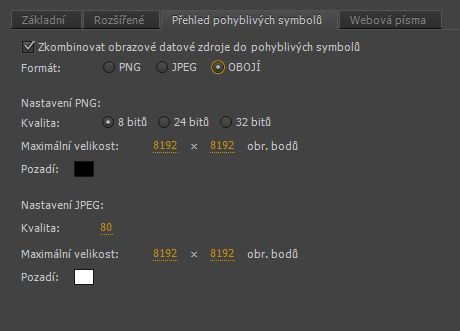 Pokud řadu bitmap použitých v dokumentu HTML5 Canvas exportujete jako jediný přehled obrázků pohyblivých symbolů, snížíte tím počet serverových požadavků, zmenšíte velikost výstupu a zlepšíte výkon. Pohyblivé symboly můžete exportovat buď jako PNG (výchozí), JPEG nebo obojí.