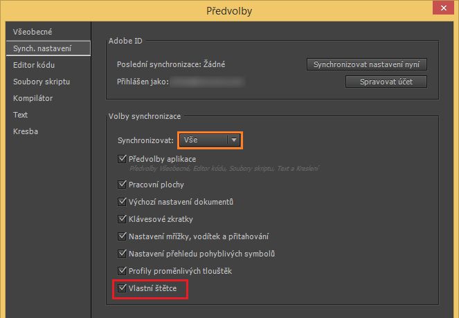 Pomocí předvoleb Animate můžete své vytvořené štětce synchronizovat do cloudu. Uděláte to tak, že v systému Windows kliknete na Úpravy > Předvolby, na Macu na Animate > Předvolby. Možnost synchronizace vlastních štětců naleznete v části Nastavení synchronizace, jak vidíte níže: